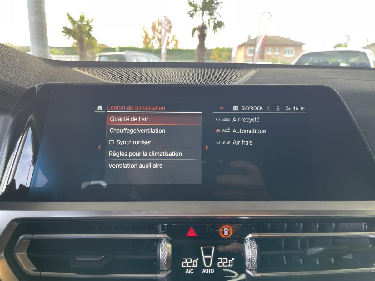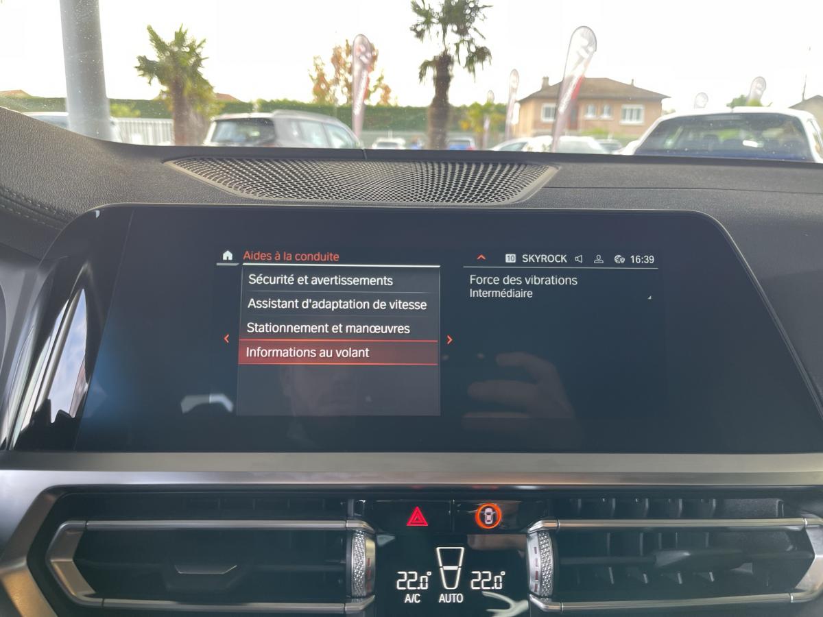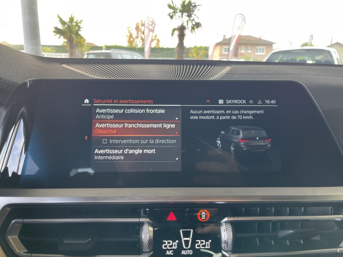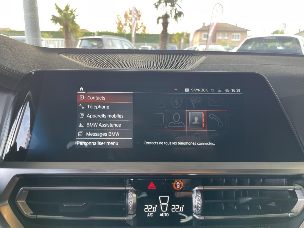 ABSAccoudoir avant/arrièreAide au démarrage en côteAirbagsAllumage automatique des projecteursAppleCarPlay / AndroidAuto Attention Assist : système de détection de somnolenceAuto HoldAvertisseur de risque de collision (détection par caméra)Avertisseur franchissement de ligne Banquette arrière 3 places avec dossiers rabattables en trois parties (40/20/40)Bluetooth Caméra de recul Climatisation automatique 3 zones Commande vocaleDémarrage sans clé via le bouton de démarrage Start/Stop avec contour chroméDétecteur de pluie Détecteur de somnolence Eclairage d'ambianceEcran tactile ESPFeux de croisement automatique Feux de jour à LEDFixations ISOFIX aux places latérales arrières pour sièges enfantFrein de parking électromécaniqueGPSHayon a ouverture électrique mains libres Jantes en alliage léger 18'' diamantées Kit anti-crevaison Palettes au volant Prise 12VPrise USB avant Prise USB-C X2 arrièreProjecteurs antibrouillard à LEDProjecteurs BMW LEDRégulateur et limiteur de vitesseRétroviseurs extérieurs à réglage électrique Rétroviseurs extérieurs rabattables électriquement et électrochromatique du côté conducteurRétroviseurs intérieur jour/nuit automatique Radars de stationnement avant et arrière PDCReconnaissance des panneaux de signalisation Sélecteur de mode de conduite - 3 modes : "ECO PRO", "Confort" et "Sport"Sellerie Alcantara / Similicuir Sensatec Schwarz avec surpiqûres contrastantes bleuesSièges conducteur et passages réglables en hauteur et inclinaison du dossierSortie d’échappement simple, ronde et chromée de chaque côté Touches multifonctions sur le volantVitres électriques avant et arrière Volant M gainé cuirVolant réglable en hauteur et en profondeur