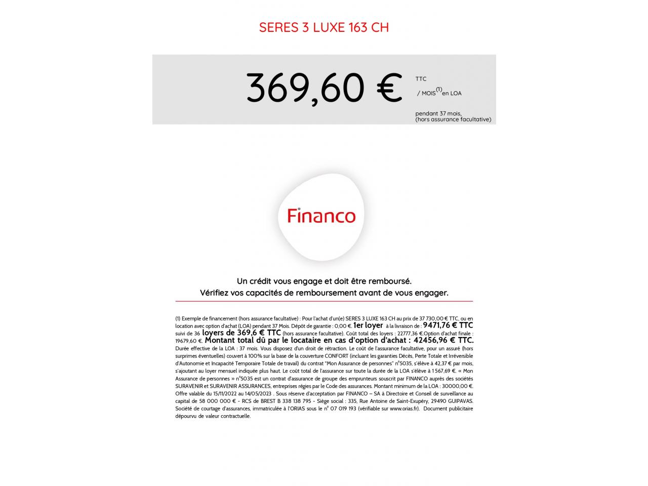 Nous vous proposons cette SERES SERES 3 au prix de 31 490 €, celle-ci a au compteur 10 km. Elle a été immatriculée le 01-08-2022 et dispose d'une puissance de 163ch din.